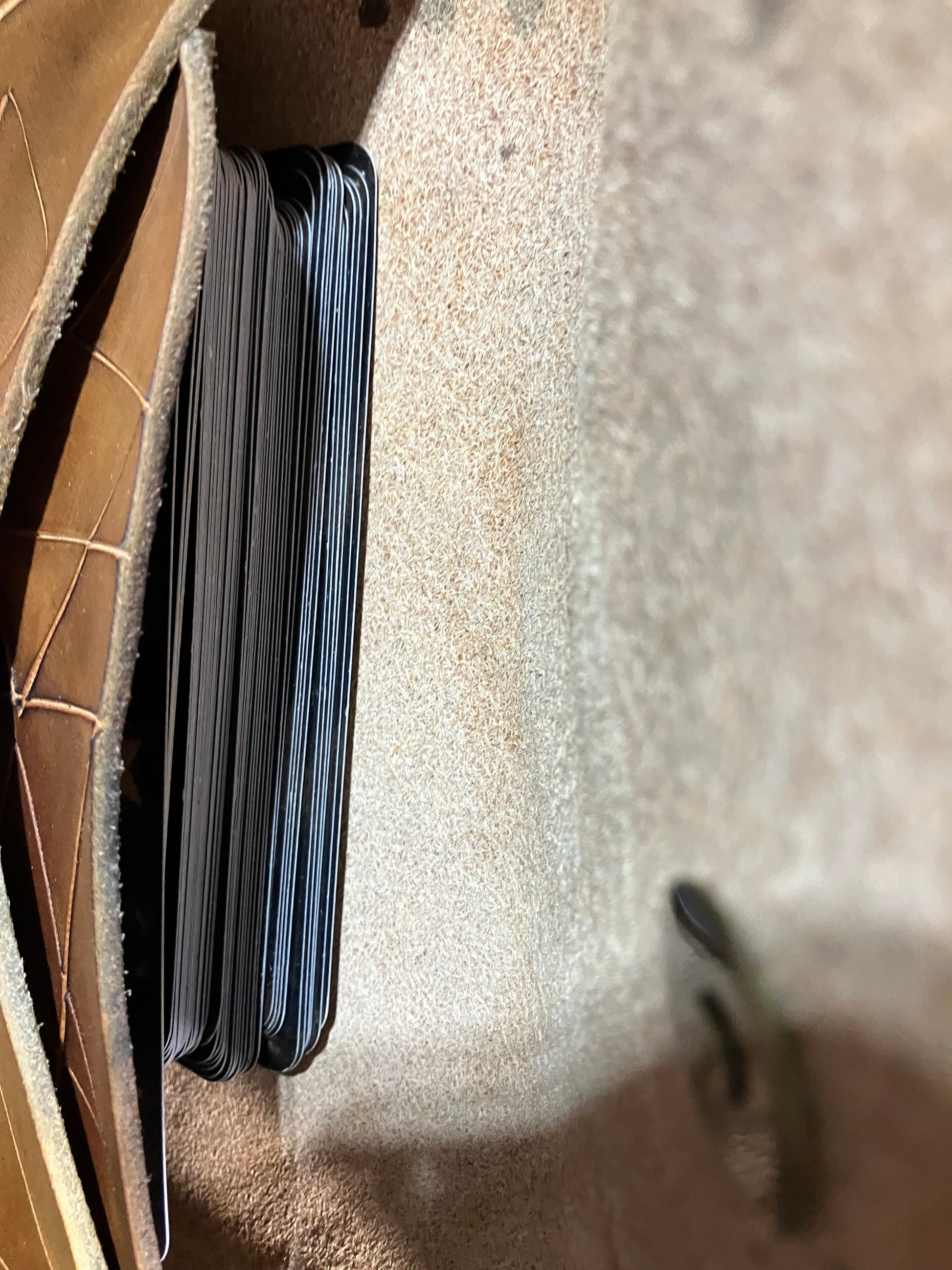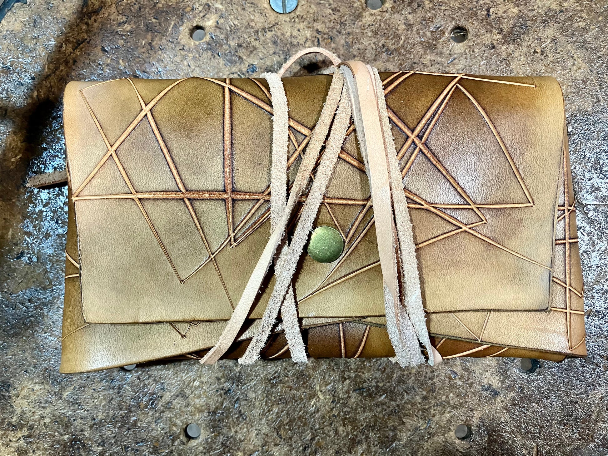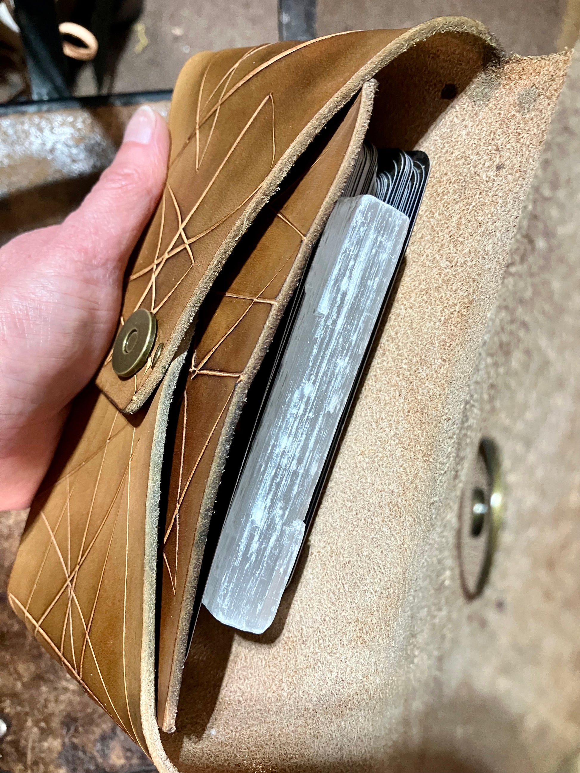one of a kind handmade envelope clutch that also fits a beloved tarot deck? love!! rider waite smith regular deck size shown — with selenite :: crafted in woodstock by sarah wilder with vegetable tanned american bridle leather from wickett and craig — and a super secret leather technique to get those beautiful slashes! antique brass magnetic snap and rivets :: deck and wand not included
